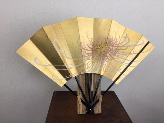 金色の箔を施した紙に扇面師が手書きで絵を描いています。5本の扇骨に張り付け、屏風のような美しい飾り扇子となっています。菊が描かれています。優しい味わいです。