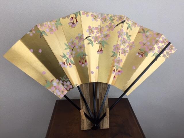 金色の箔を施した紙に扇面師が手書きで絵を描いています。5本の扇骨に張り付け、屏風のような美しい飾り扇子となっています。桜が華やかに描かれています。