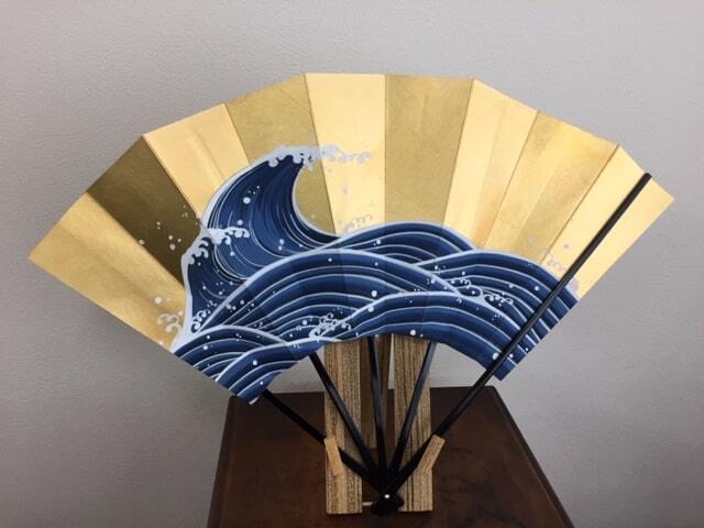 金色の箔を施した紙に扇面師が手書きで絵を描いています。5本の扇骨に張り付け、屏風のような美しい飾り扇子となっています。大波が描かれています。